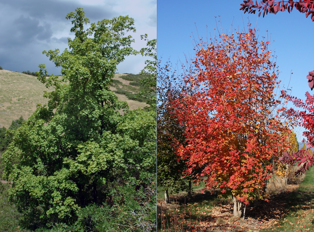 Bigtooth Maple is a slow growing tree that is a perfect choice for smaller yards. This tree is native to the Western U.S. and It is well adapted to alkaline soils and acclimates nicely to drier conditions. A very popular choice for sites that have difficult growing conditions. It develops a broad, spreading canopy and often grows into a multi-stemmed small tree. The 2-5 inch diameter, lustrous, dark green lobed leaves are noted for their striking brilliance in fall, when they change into beautiful shades of red, orange and yellow before dropping.