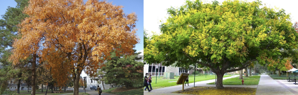 Kentucky Coffeetree is a large tree with large, compound leaves. The canopy is broad and round, and the mature tree makes it a decent shade tree. Male trees have smaller 4-inch flowers, while female trees have larger, showier, and more fragrant clusters of flowers – up to 12 inches long. The flowers transform into a brown bean-shaped pod that will persist into winter after all the leaves have fallen. In fall, the leaves turn bright yellow. The bark is brown and heavily textured with ridges and furrows. Kentucky Coffeetree is a fabulous low-water, large shade tree for the Colorado Springs area.