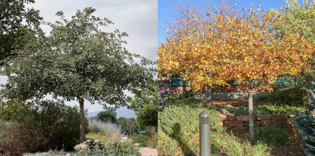 This large growing shade tree is highly recommended for Colorado’s Front Range urban area. It is water-thrifty and tolerates a wide range of soil conditions as well as difficult extreme weather conditions. One of the more alkaline-tolerant oaks, this handsome tree has large, sharp-toothed leaves that are a dark yellow-green above with a white cast to the underside. Acorns are usually not produced until trees are very mature.